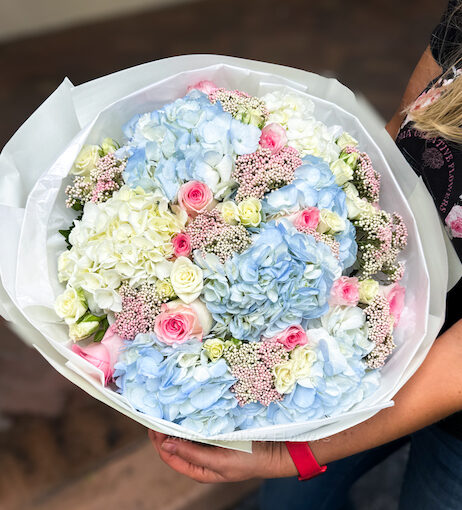 A soft and playful bouquet inspired by the lightness and joy of celebration. Confetti features a delicate mix of hydrangeas in pastel blue and white tones, complemented by soft pink accents and seasonal blooms, creating an airy, romantic composition full of texture and charm.