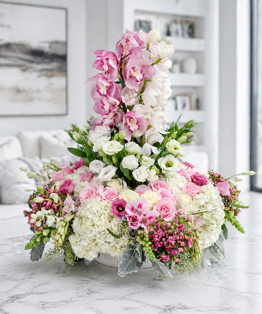A soft and dreamy centerpiece inspired by delicate pastel tones and romantic textures. Cotton Candy features an elegant blend of roses, spray roses, hydrangea, orchids, and seasonal blooms, beautifully arranged with lush greenery to create a light, airy, and feminine look.