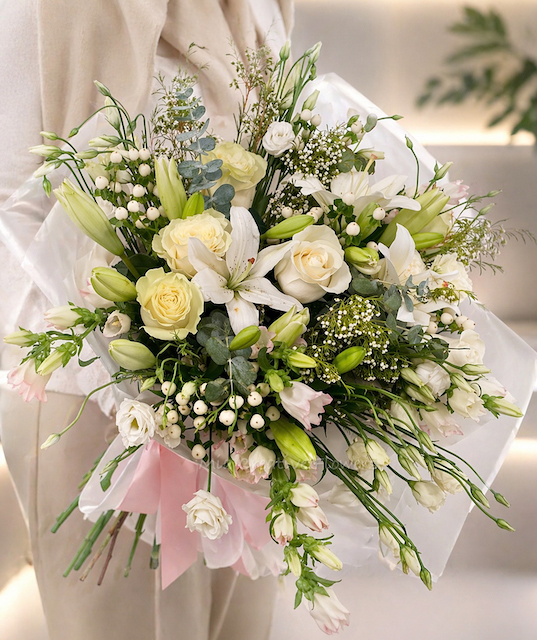 A fresh and elegant bouquet inspired by light vibes. This arrangement features a delicate mix of roses, lilies, and seasonal blooms combined with airy greenery in soft white and green tones.