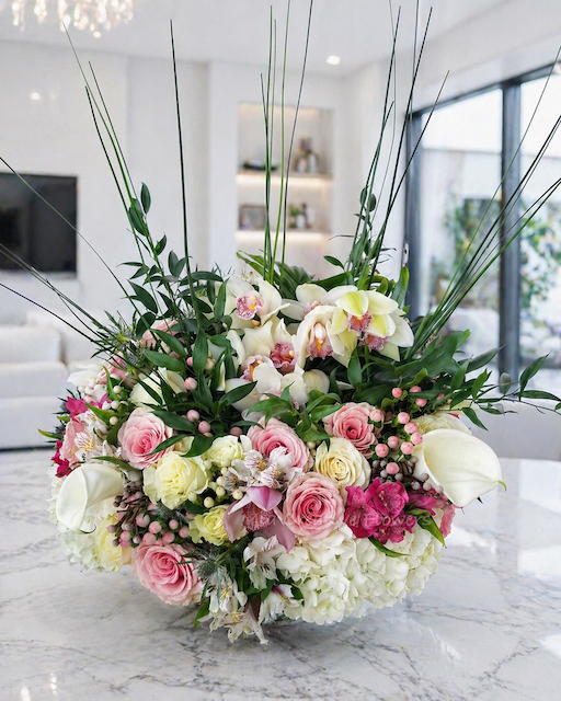 A modern and airy centerpiece designed with a soft, romantic palette and a touch of contemporary structure. Strawberry Bubble features a beautiful mix of premium roses, alstroemeria, orchids, calla lilies, hydrangea, hypericum, and fresh greenery, accented with elegant lines for a stylish and elevated look.