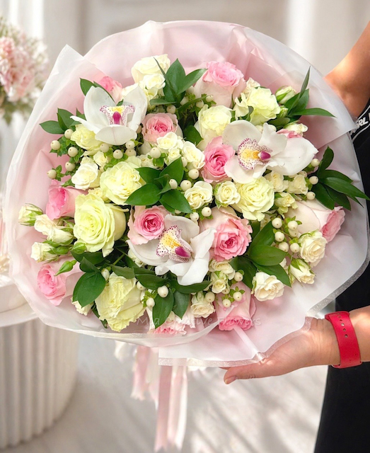 A fresh and joyful bouquet designed to brighten any day. Sunny Smile features a delicate mix of roses, spray roses, orchids, and seasonal blooms in soft white and blush pink tones, complemented by fresh greenery for a light and elegant look.